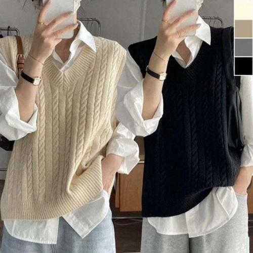 [셀러허브_여성트랜드패션]여자 스웨터 코디 골지 트위스트 V넥 조끼