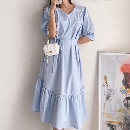 [옷자락]여자 하객룩여름 퍼프반팔 박시핏 프릴 리본끈 롱원피스