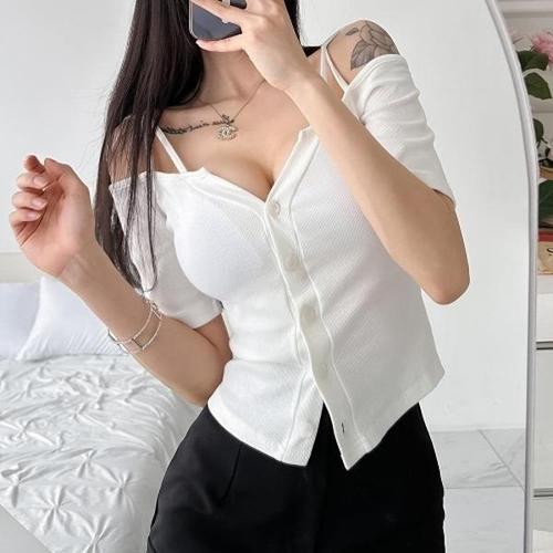 [신상오픈런]|KMT5BDD|티러파 티셔츠 여성 어깨끈 짧은 오프숄더 스트레치 버튼_18175401_597559