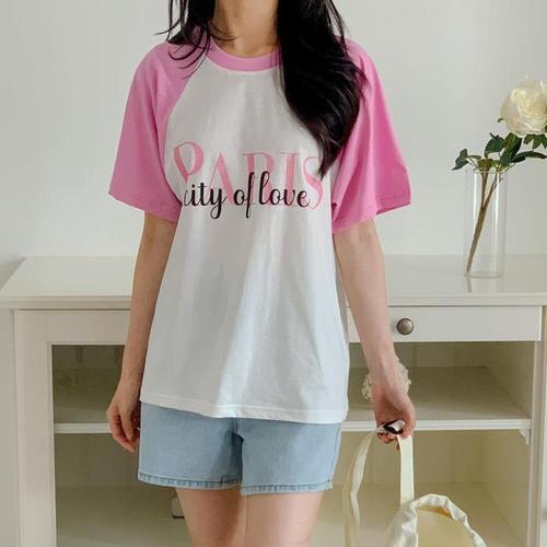 [다잇템]여자 콘트라스트 캐쥬얼 라글란 필기체 티셔츠 (10245054A)