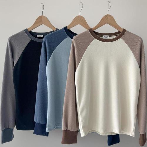 [미라클세븐]여성 톤온톤 배색 나그랑 롱슬리브 골지 겨울 라운드 티셔츠