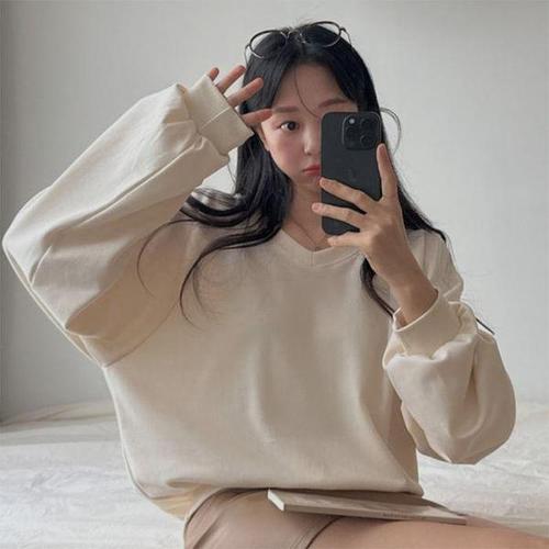[다잇템] 여자 박시핏 캠퍼스룩 민무늬 라글란 V넥 맨투맨