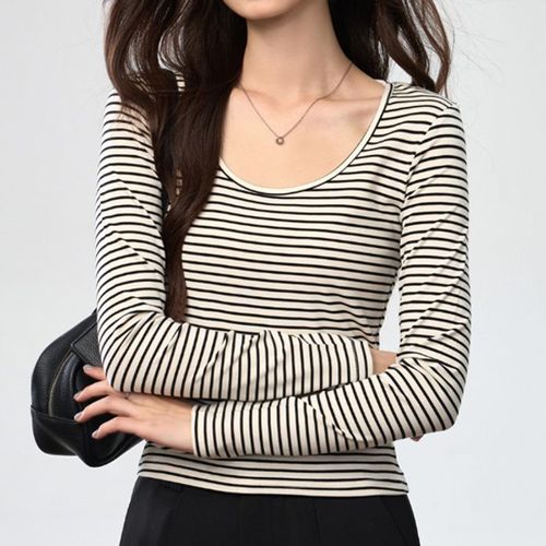 나바바 / NT1427 캐주얼 얇은 단가라 라운드넥 긴팔 티셔츠