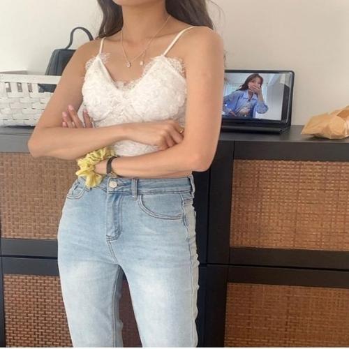 |KHT93F8|여성 스판 골지 레이스 민소매 크롭탑 무지컬러 티셔츠