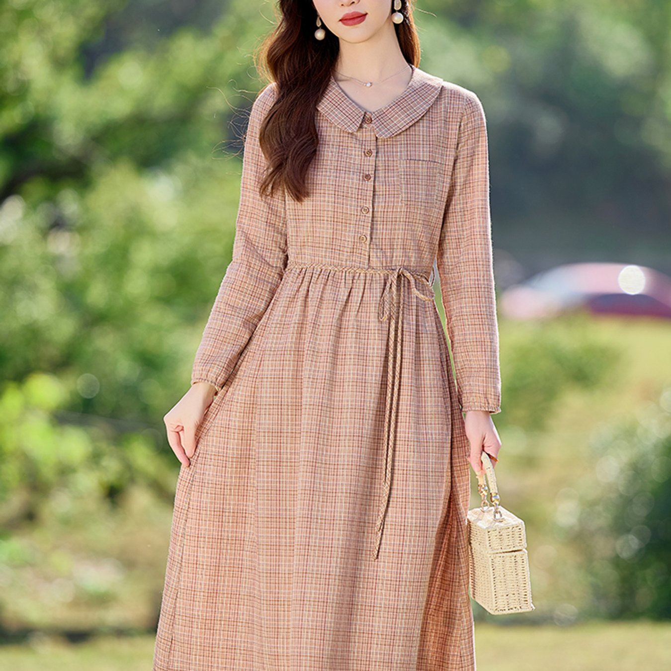 TEMU 여성용 체크무늬 원피스 2025년 봄가을 신상 한국 스타일 인형 칼라 허리마감 품격 있는 문학적인 나이 감추는 스커트