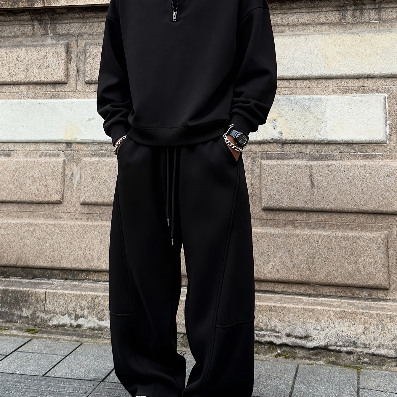 TEMU 세련된 남성용 캐주얼 및 레저 의상 세트. 솔리드 컬러 트렌디 후드 드로스트링 재킷과 사이드 포켓 드로스트링 테이퍼드 팬츠가 특징입니다. 이 긴소매 지퍼업 재킷은 성숙한 남성을 위한 완벽한 선택이며 다양한 색상으로 제공됩니다.