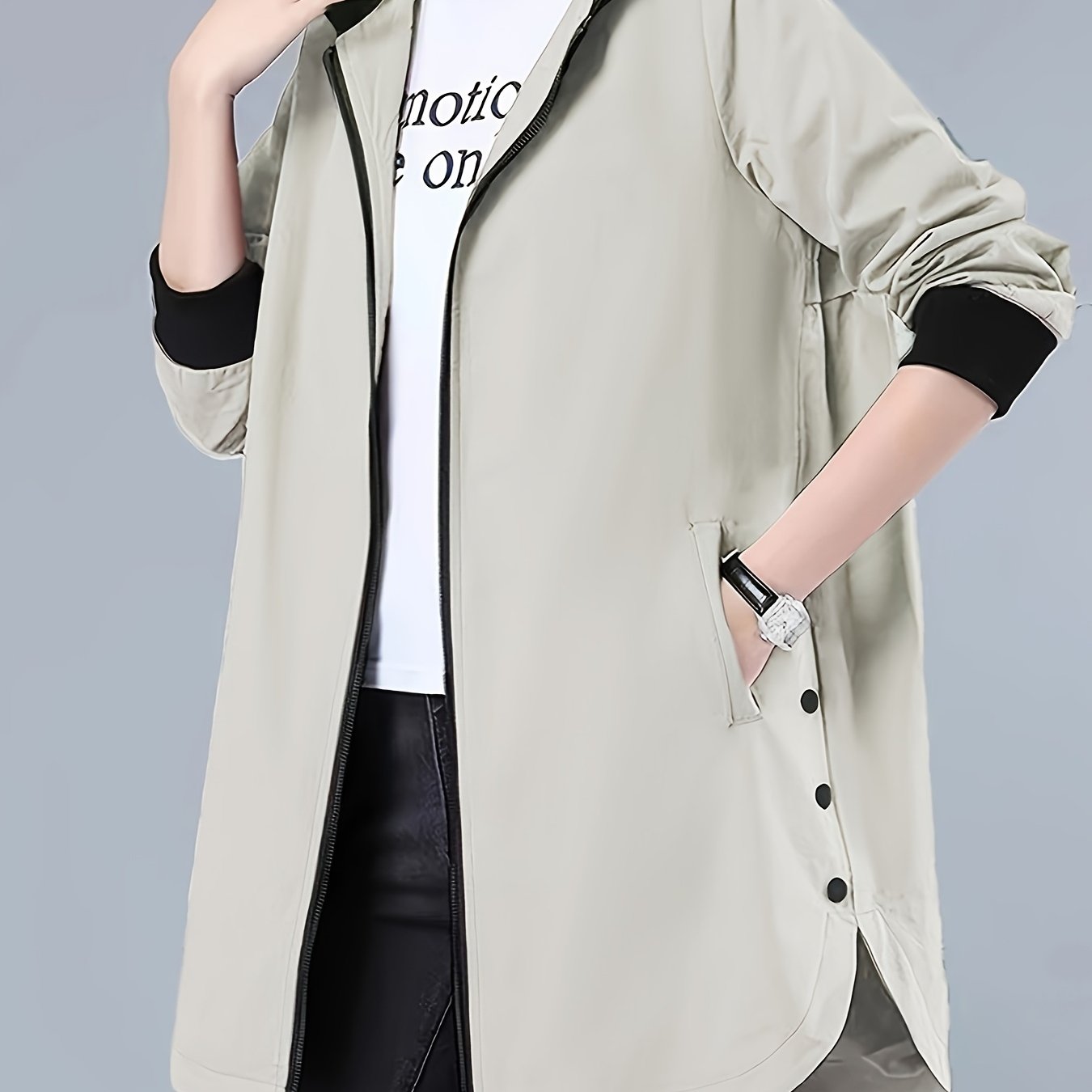 TEMU 봄가을 여성 캐주얼 루즈 코트, 심플 후드 롱 코트, 오픈 도어 지퍼, 대비 리브드 커프스, 패셔너블하고 다용도 긴소매 여성 의류