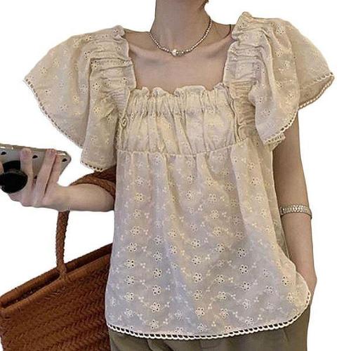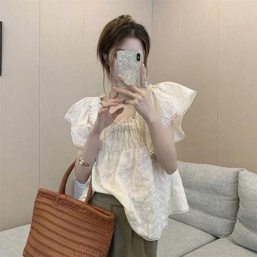 [셀러허브_여성트랜드패션]여성 프릴 여름 러블리한 레이스펀칭 반팔블라우스