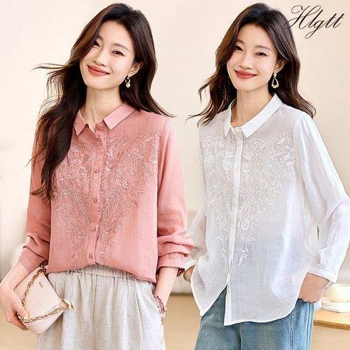 [헬리꽁땡](55~88)2종세트 여성 플랫카라 플라워 꽃자수 펀칭 레이스 자수 블라우스 루즈핏 시스루 거즈 ..
