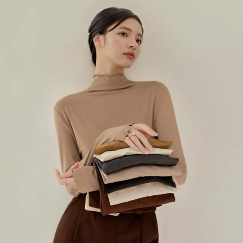 [오너클랜]인기상품 여자용 봄가을 목폴라 티셔츠 프릴 긴팔 피치기모 레이어드 반목티 [WFLHT24_260208]