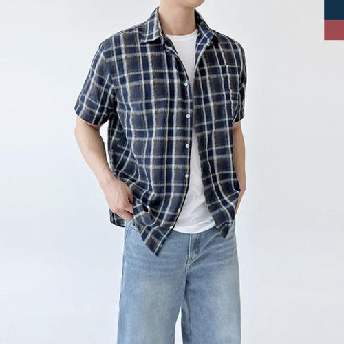 [옷자락]남성 클래식 린넨 배색 체크 카라넥 반팔 셔츠