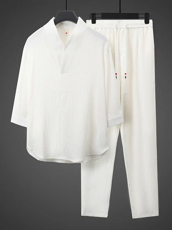 여름 얇은 아이스 실크 캐주얼 루즈 슬리브 티셔츠 투피스 세트 젊은 남성용 편안하고 통기성 좋은 가벼운 긴 바지