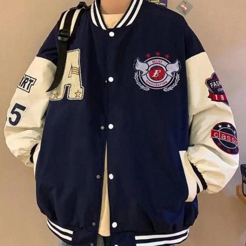 ANYOU 빈티지 스타일 오버사이즈 자켓 여성용 남성용 블루 컬러 패치 디자인 스포츠 캐주얼 자켓