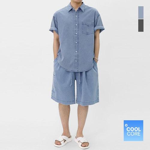 스콰즈 남성 아이스 스판 데님셔츠 반팔 반바지 셋업 SYHT006
