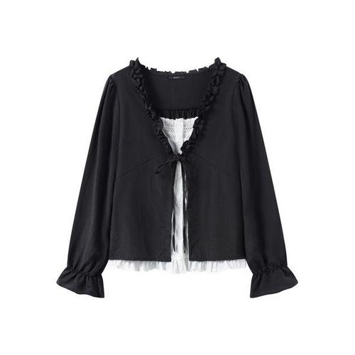 [지지피엑스]프릴 넥 레이어드 배색 긴팔 블라우스 (GQABA020D)