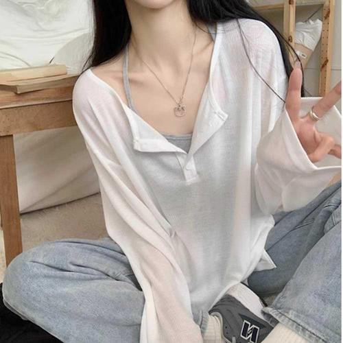 레이어드 루즈 핏 긴팔 티셔츠 헨리 넥 버튼 무지 WFL0IG1