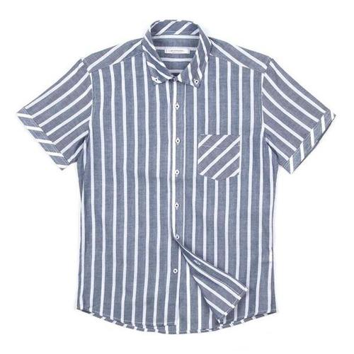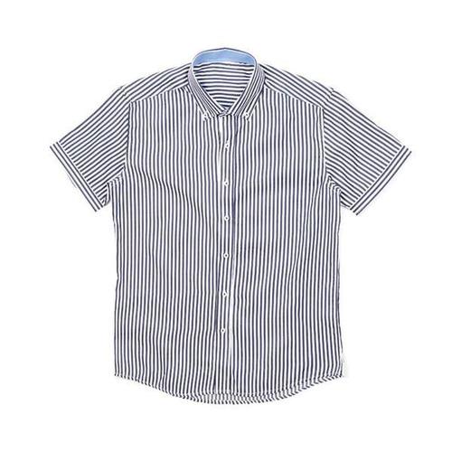 [에이치플러스몰]버튼다운 남자스트라이프 네이비반팔셔츠
