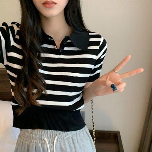 [에이치플러스몰]투버튼 베이직 폴로카라 하프슬리브줄무늬 풀오버