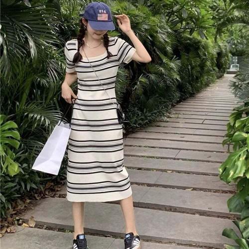[오너클랜]인기상품 스트라이프 여름 반팔 롱 원피스 스퀘어넥 비치 데일리 드레스 [WFLL8Z2_260304]