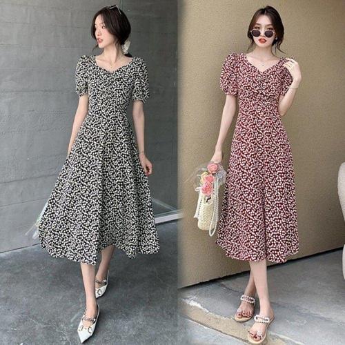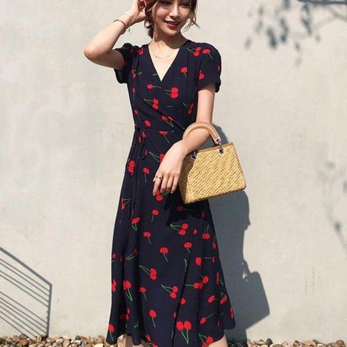 [오너클랜]인기상품 체리 무늬 브이넥 니트 여름용 반팔 프릴 미디 롱원피스 [WFLL7N0_260304]