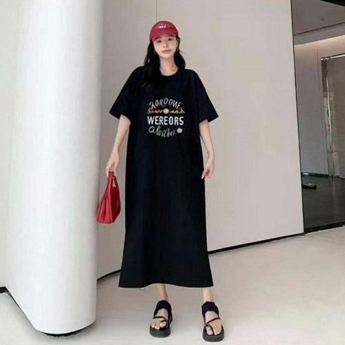 [오너클랜]인기상품 오버핏 반팔 롱 원피스 영문 레터링 캐주얼 블랙 드레스 [WFLL8V9_260304]