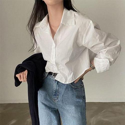 [셀러허브_여성트랜드패션]ONM 여성 크롭 화이트 셔츠 베이직 데일리 남친룩