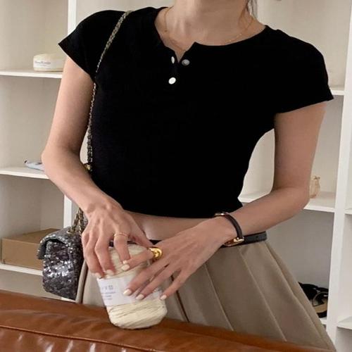 [셀러허브_여성트랜드패션]ONM 여성 여름 쿨 골지 크롭 반팔티셔츠 냉감 단추 반팔티