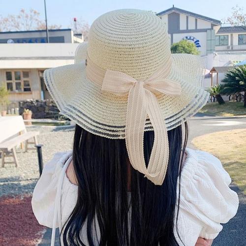 [XBJH2M9M]Jon 내추럴 밀짚모자 러브리본 비치 모자