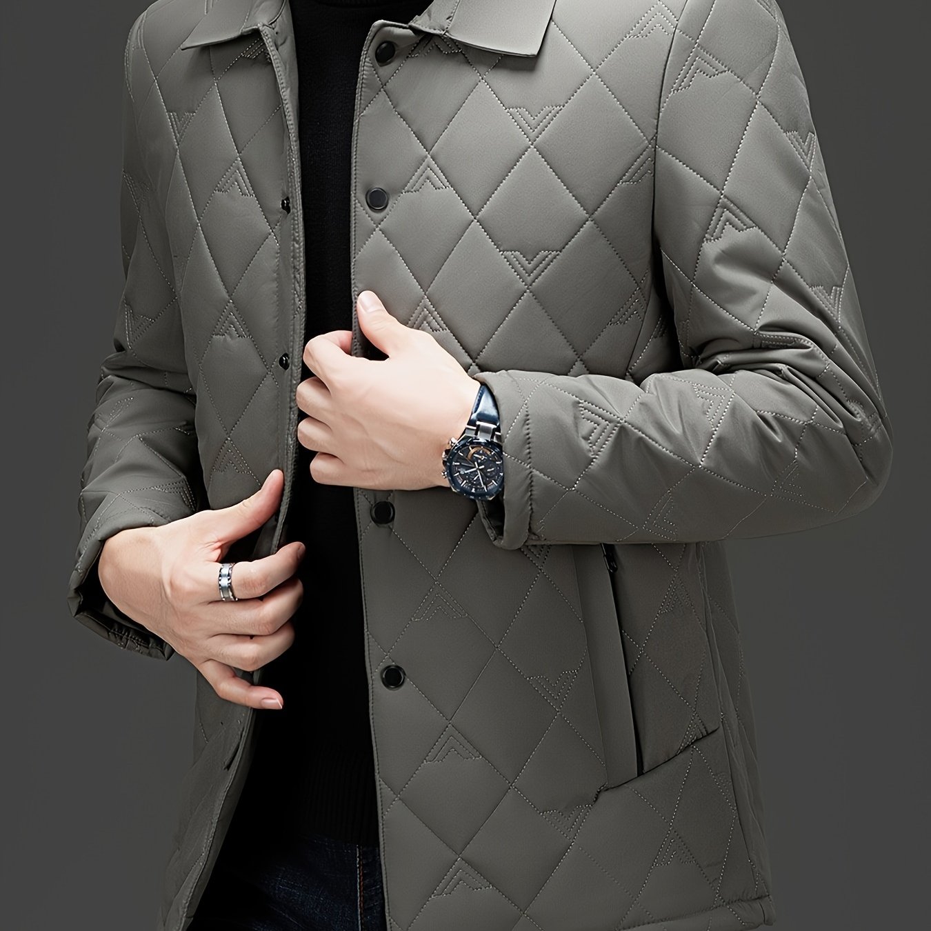 TEMU 2024 신상 남성 정장 칼라 패딩 코트 재킷, 올오버 자카드 패턴, 캐주얼 웨어, 여행, 외출용