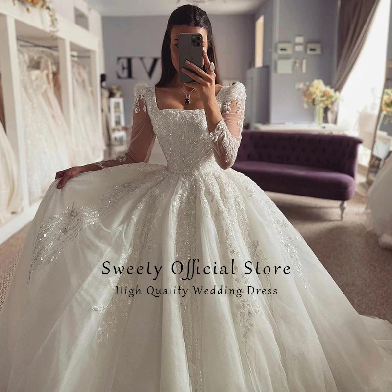 맞춤형 새틴 볼 가운, 긴팔 웨딩 원피스, 2025 공주 레이스 아플리케, 진주 구슬 신부 가운