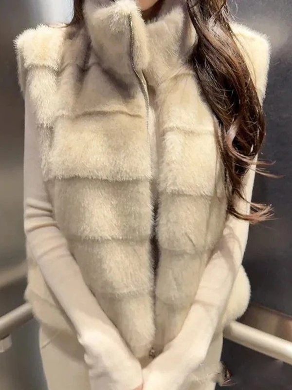 겨울 시크 럭셔리 페이크 퍼 조끼 여성용 지퍼 슬리브리스 스탠드 칼라 따뜻한 아우터 숏 스타일 스트레이트 튜브형