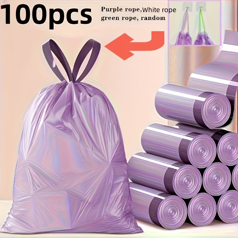 TEMU 100팩 헤비듀티 퍼플 끈끈이 쓰레기봉투 - 주방, 욕실, 침실 및 가정용 다목적 플라스틱 쓰레기봉투, 광택 마감, 15개입, 거실 및 화장실에 적합한 쓰레기봉투, 음식물쓰레기봉투, 두꺼운 비닐봉투, 쓰레기봉투 대형