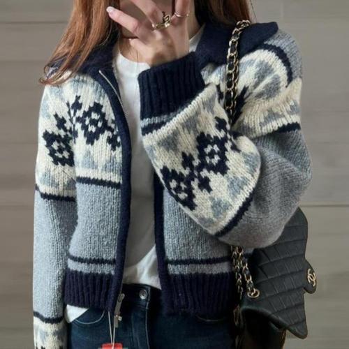 [신상오픈런]여성 노르딕 눈꽃 디자인 빈티지 크롭 집업 니트 가디건 (45265714)