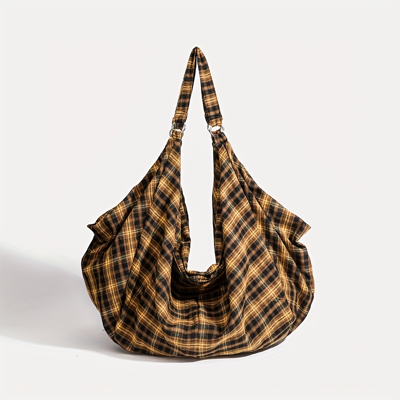 TEMU 빈티지 옐로우 체크 캔버스 토트백 - 대용량, 어깨 & 크로스바디 백 지퍼 클로저, 폴리에스터 안감, 도시 스타일, 캐주얼 숄더백|빈티지 체크 디자인|내구성 있는 캔버스 소재, 토트백