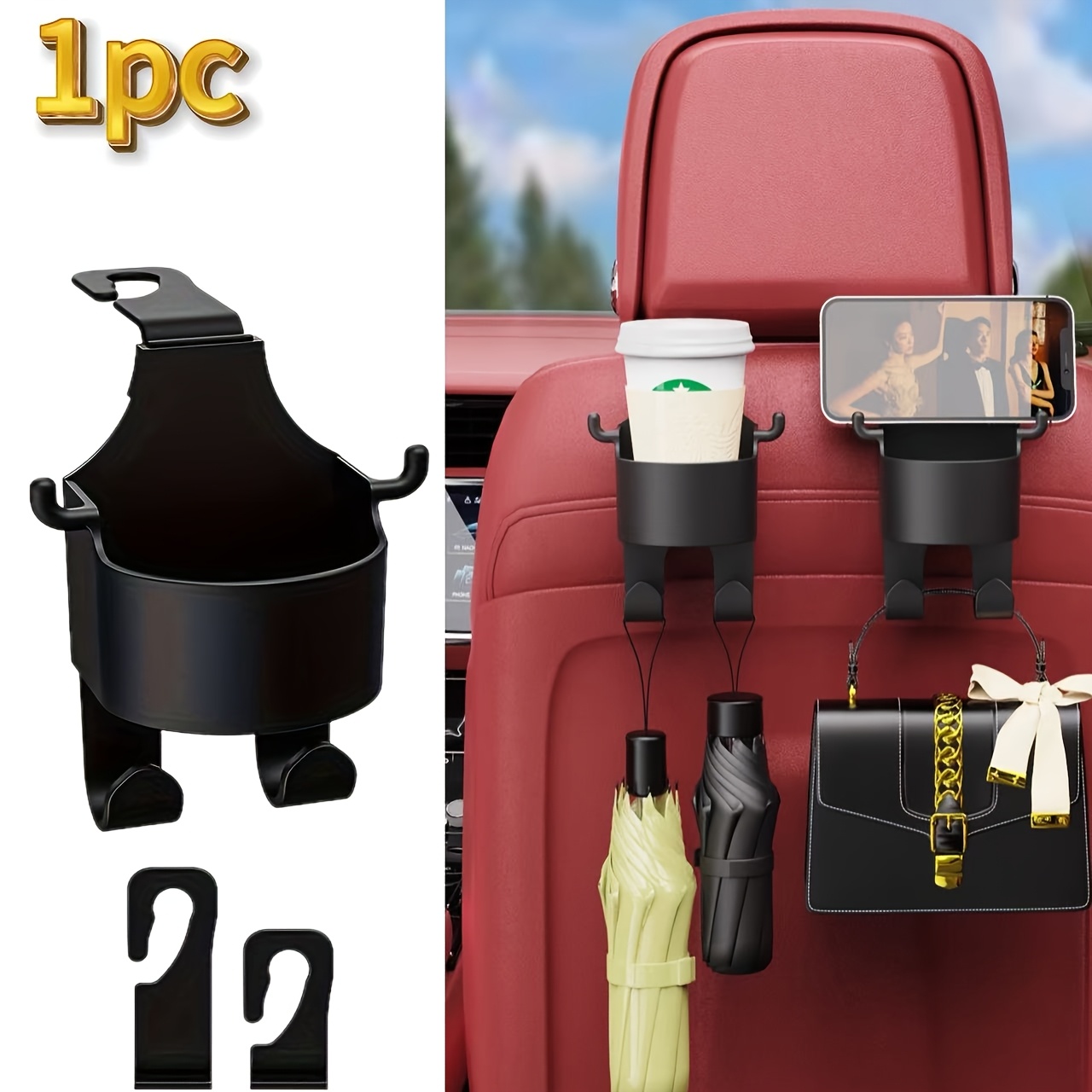 TEMU 차량 시트 헤드레스트 후크 내장 컵 홀더 포함 - 내구성 있는 PP 소재, 설치가 쉽고, 블랙, 식료품, 옷, 가방에 적합한 다기능 수납, 차량 시트 헤드레스트 후크 내장 컵 홀더 포함