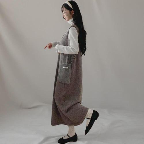 [깨비몰] 여성 단추 슬림 니트 롱 원피스 골지 롱치마