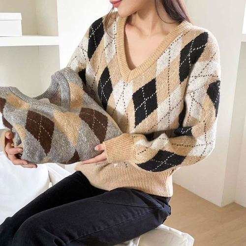 여자 다이아 빅사이즈 롱슬리브 V넥 스웨터 격자 티셔츠