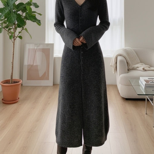 보니제이 / A라인 겨울 니트원피스 앞트임 브이넥 롱 미니버튼 슬