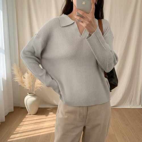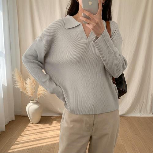 [옷자락] 여성 봄 오픈카라 골지 긴팔 니트 박스핏 울티