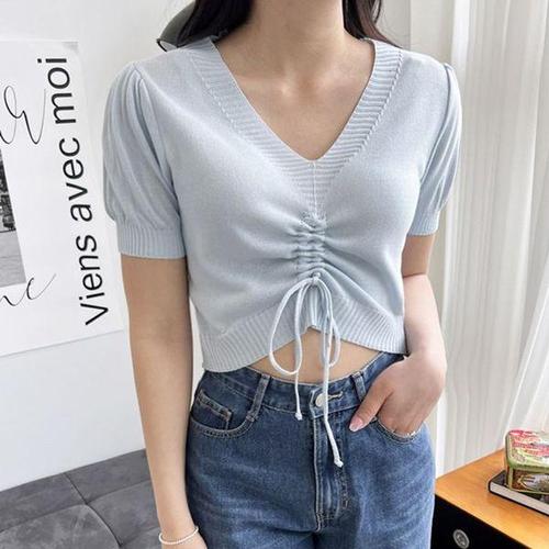 [에이치플러스몰]여성 스트링 크롭 반팔 니트 1P 여름 퍼프소매 티셔츠