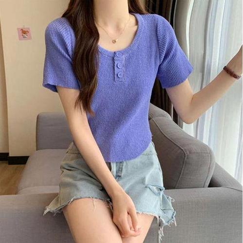 [셀러허브_여성트랜드패션]니트티 단추포인트 콕카라 여름 귀여운 반팔티 반크롭