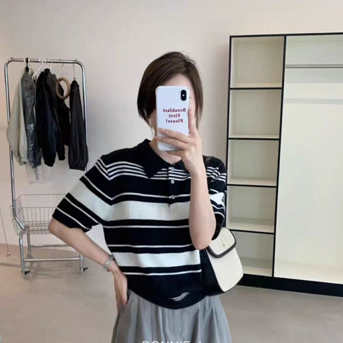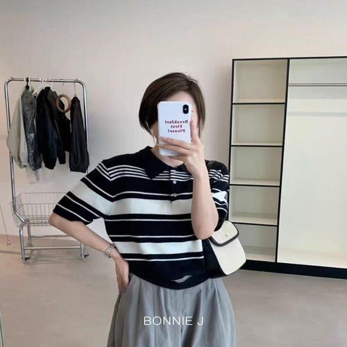보니제이 / 카라넥 3버튼 니트 크롭 반팔 티셔츠 언발 스트라이프