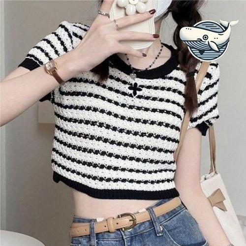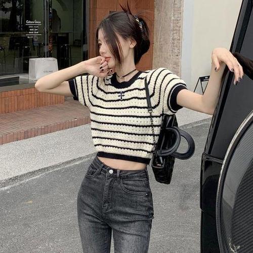[에이치플러스몰]쿨한 여자 큐티 스트라이프 크롭 니트 반팔티셔츠
