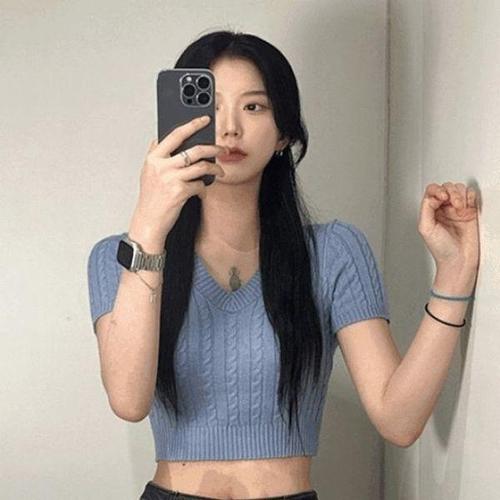 [에이치플러스몰]쫀쫀 여성 캐주얼 꽈배기 크롭 필수템 반팔 니트 티 V