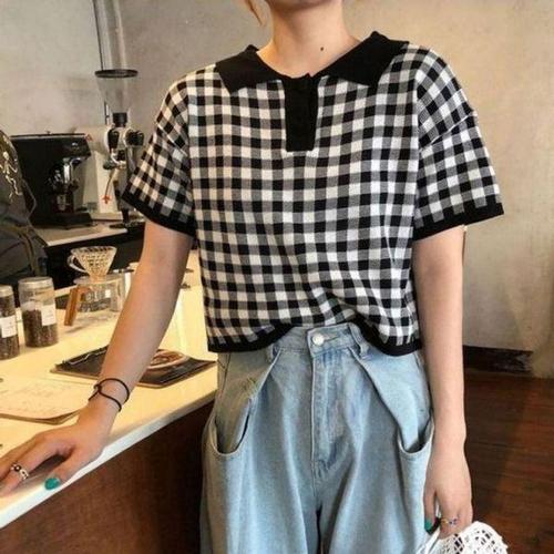 [에이치플러스몰]반크롭 인기 여성 카라 니트 감성 체크 반팔티 1P 여