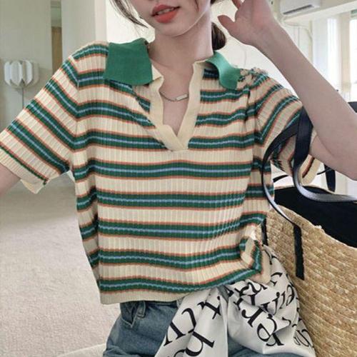 [에이치플러스몰]여성 크롭 브이넥 카라 니트 1P 스트라이프 반팔티
