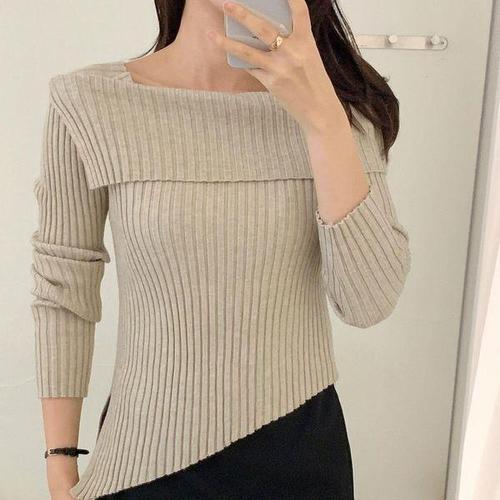 [다잇템]여성 슬림핏 면혼합 볼드숄더 언발란스 니트