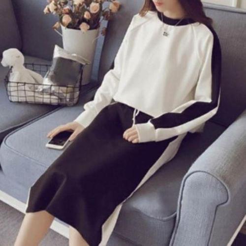 [옷자락]여성용 컬러포인트 라운드넥 맨투맨과 롱스커트 세트