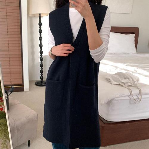[다잇템]여자 롱 울 V넥 더블포켓 슬리브리스 니트조끼