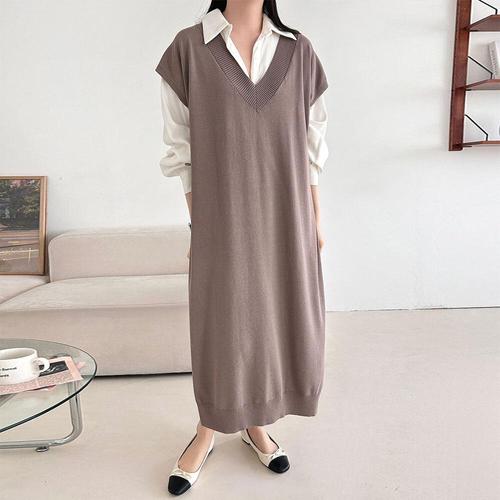 [문에이블]문에이블 여자 여성 봄 가을 간절기 루즈핏 브이넥 레이어드 데일리룩 니트 조끼 롱 원피스